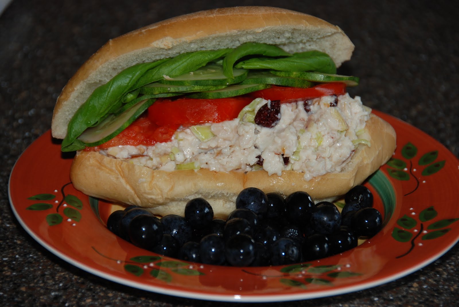 Mix it all up & assemble sandwich...I used thinly sliced cucumbers, tomatoes, and some basil leaves from the garden to finish off my sandwich. The basil really made this sandwich pop. Ate it up with some of the blueberries we picked last week.