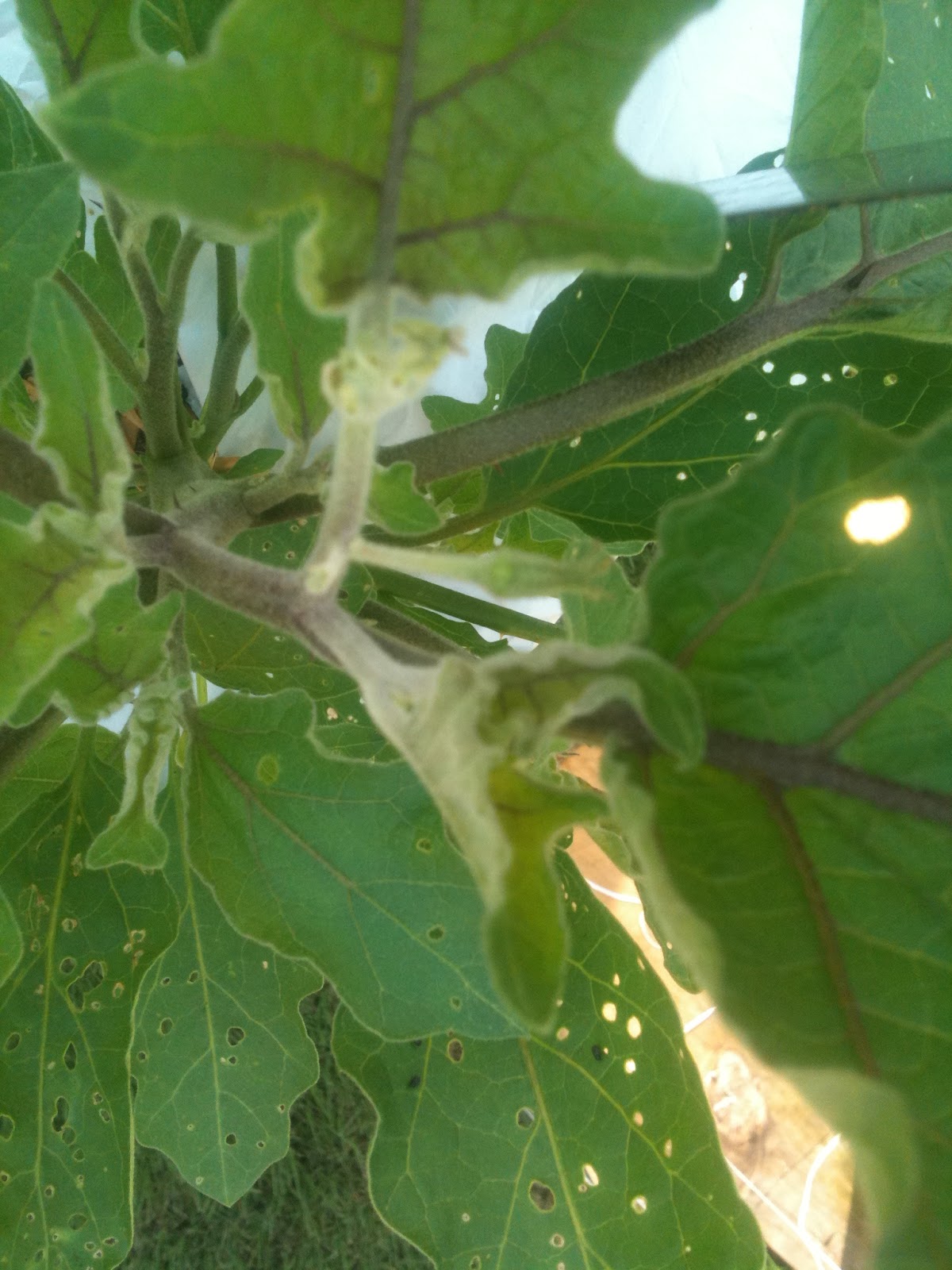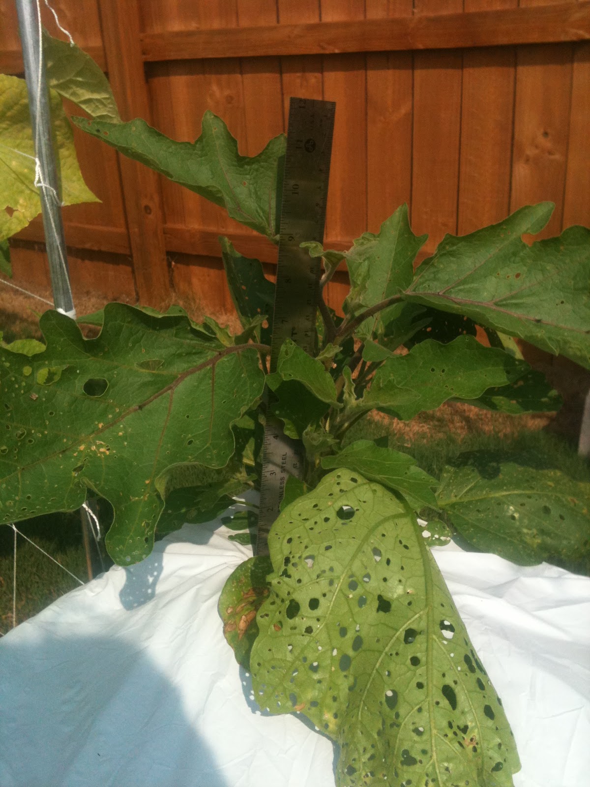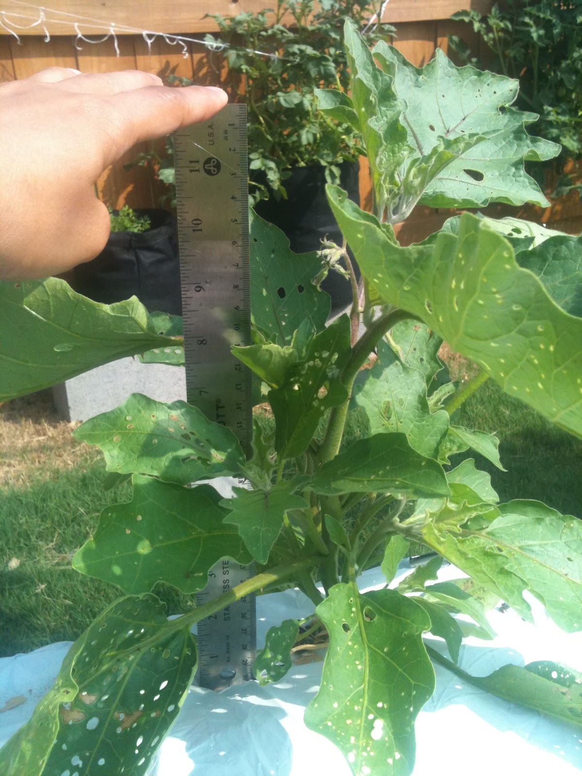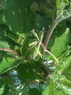The Eggplants are finally thriving. Aphids ate the leaves extensively but it's trucking along. Both plants are finally showing signs of flowering.