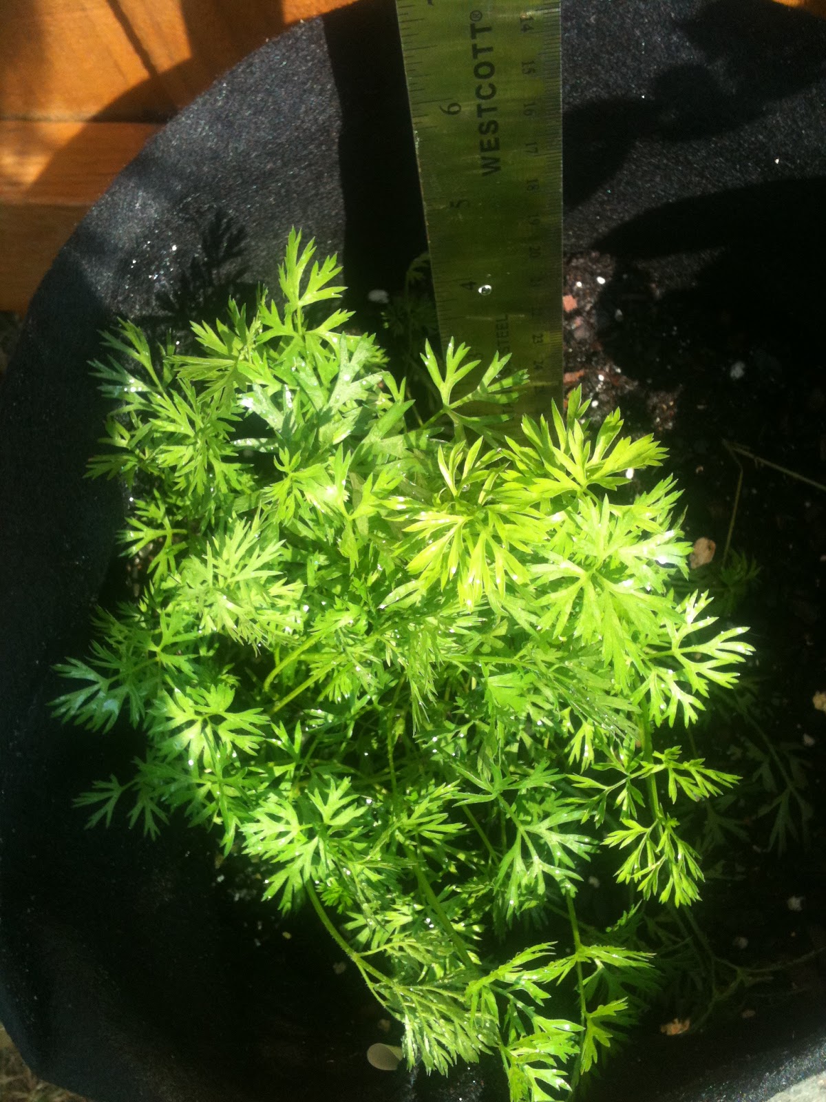 Hmmmm these baby carrots sure are boring to watch grow, nearly 5 inches tall. Steve doesn't want to grow carrots again, he finds them boring also. Their slow growth could be due to the fact that they really are more of a cool weather plant. I did remove the weed that was growing alongside them. I identified the weed to be a Fat Hen weed...this is a great website to help you identify common garden weeds...http://www.dgsgardening.btinternet.co.uk/weedlf.htm