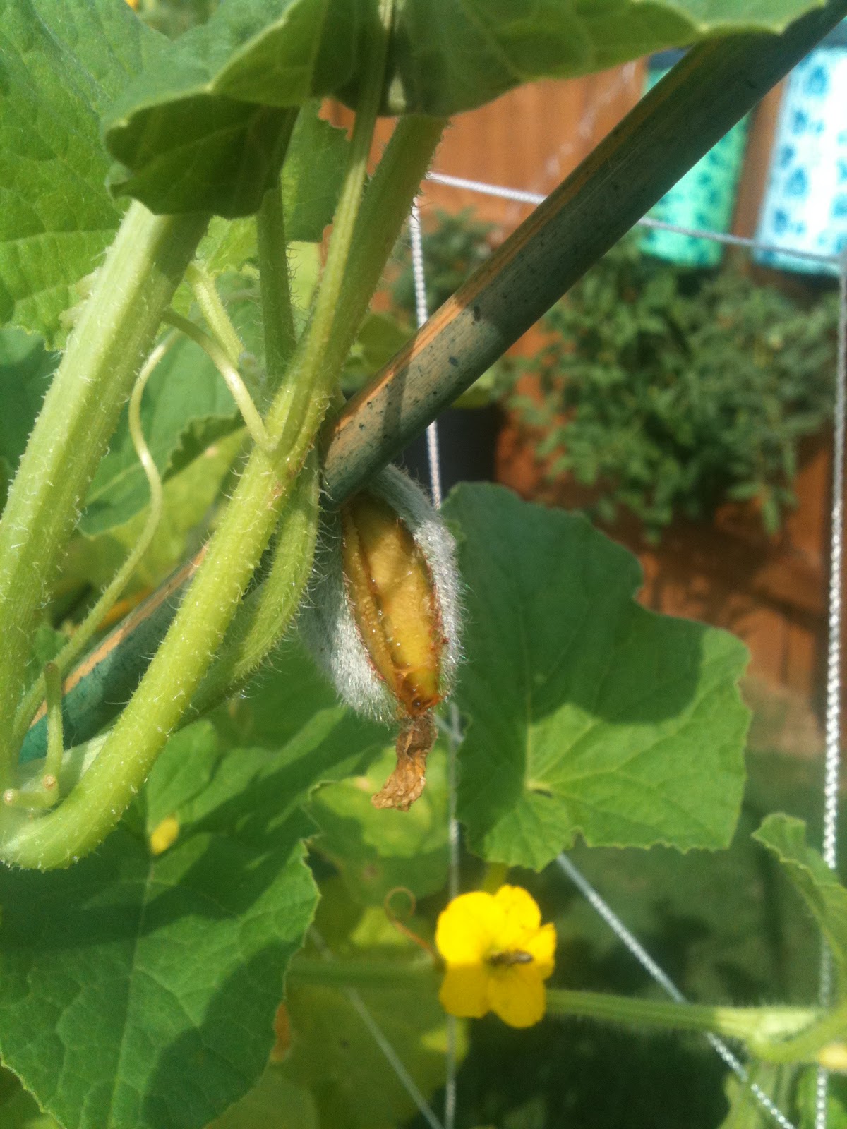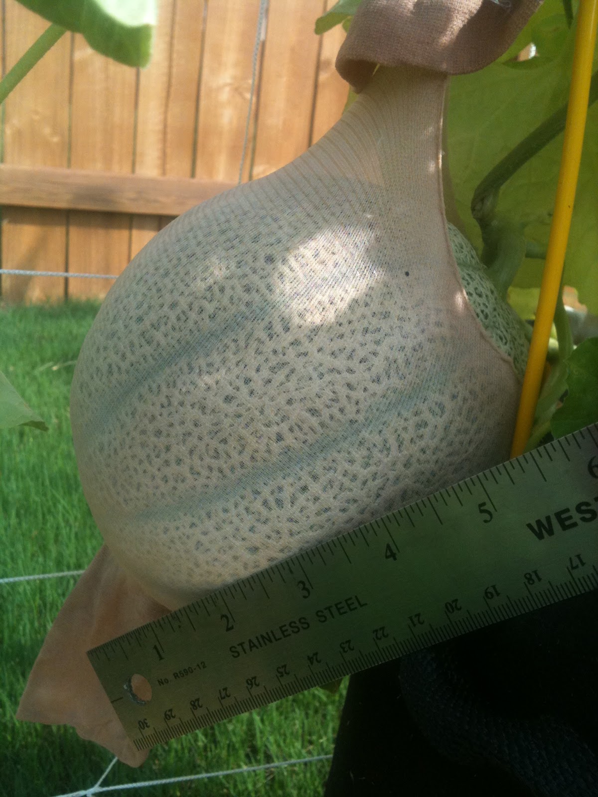 Here is the pride of the garden. This is the third melon still growing strong. The stocking is doing a great job of stretching to accommodate the melon.