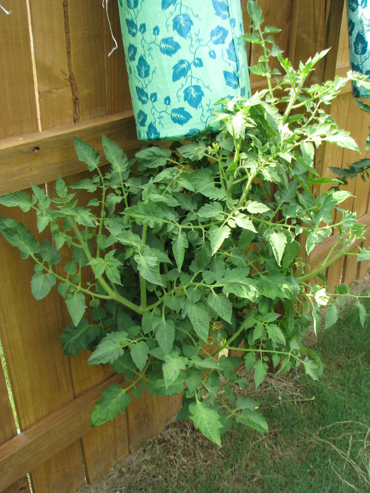 Here is a shot of the Roma Tomato bush demonstrating why I don't want to use these Topsy Turvy planters for tomatoes ever again. The water runs out onto the plant's leaves, making the plant more susceptible to disease. If water sits on plant foliage for hours, it can encourage fungal diseases to attack leaves, buds, flowers, and fruit. The water washes dirt onto the leaves also. They sure don't tell you that in those tv commercials do they?