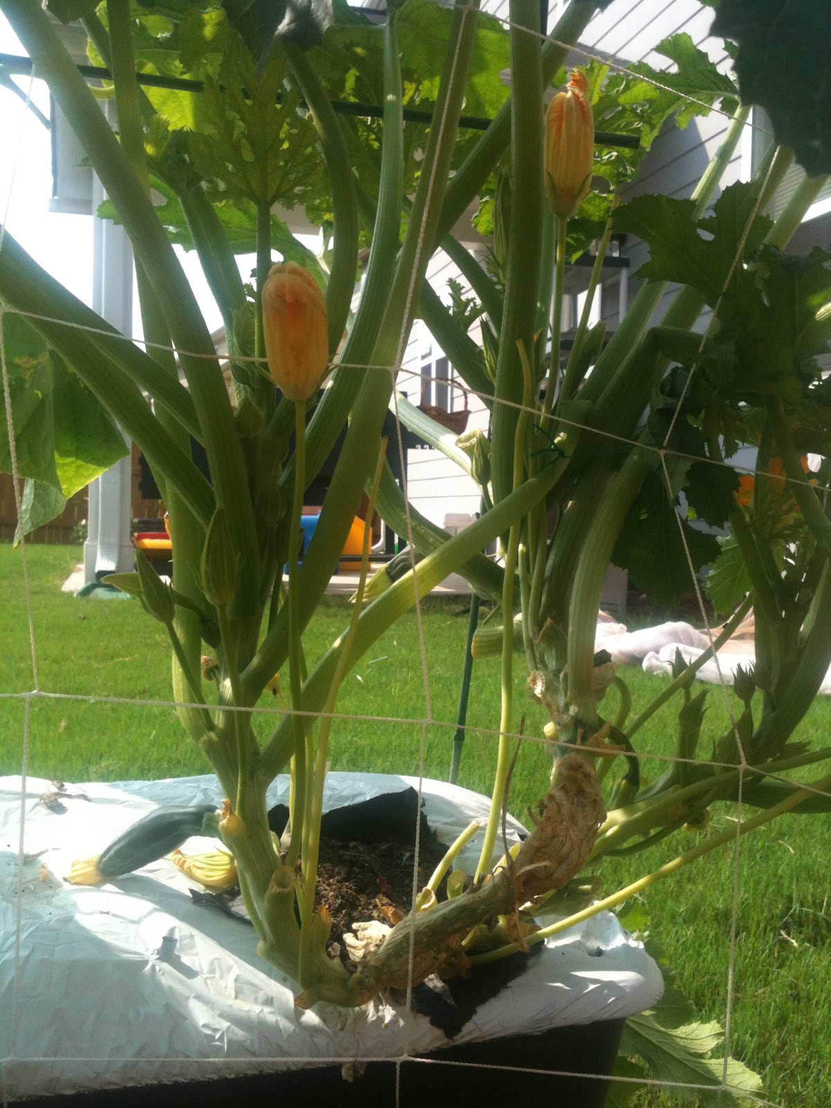 Ahhh the Earthbox with all the drama. We've had to deal with a Squash Vine Borer, Aphids, White Powdery Mildew on the leaves, and now big brown Squash Bugs & their eggs. Errrrr. I thought zucchini is supposed to be easy to grow.