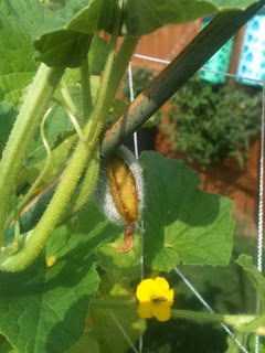 The cucumbers aren't as much trouble as their neighbor. They are our prolific producers, I've already harvested four foot long Burpless cucumbers, and about six of the Bush Pickles.